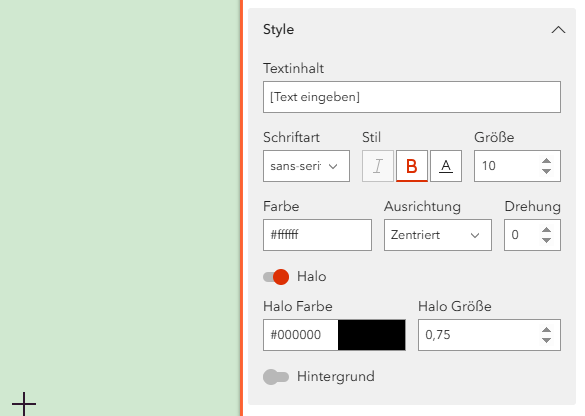 Sie können beliebige Texte in die Karte einfügen. Geben Sie Ihren gewünschten Text ein und passen Sie ggf. Schriftart, Schriftgröße, Drehung und weitere Eigenschaften an. Durch Klick in die Karte wird der Text erzeugt.